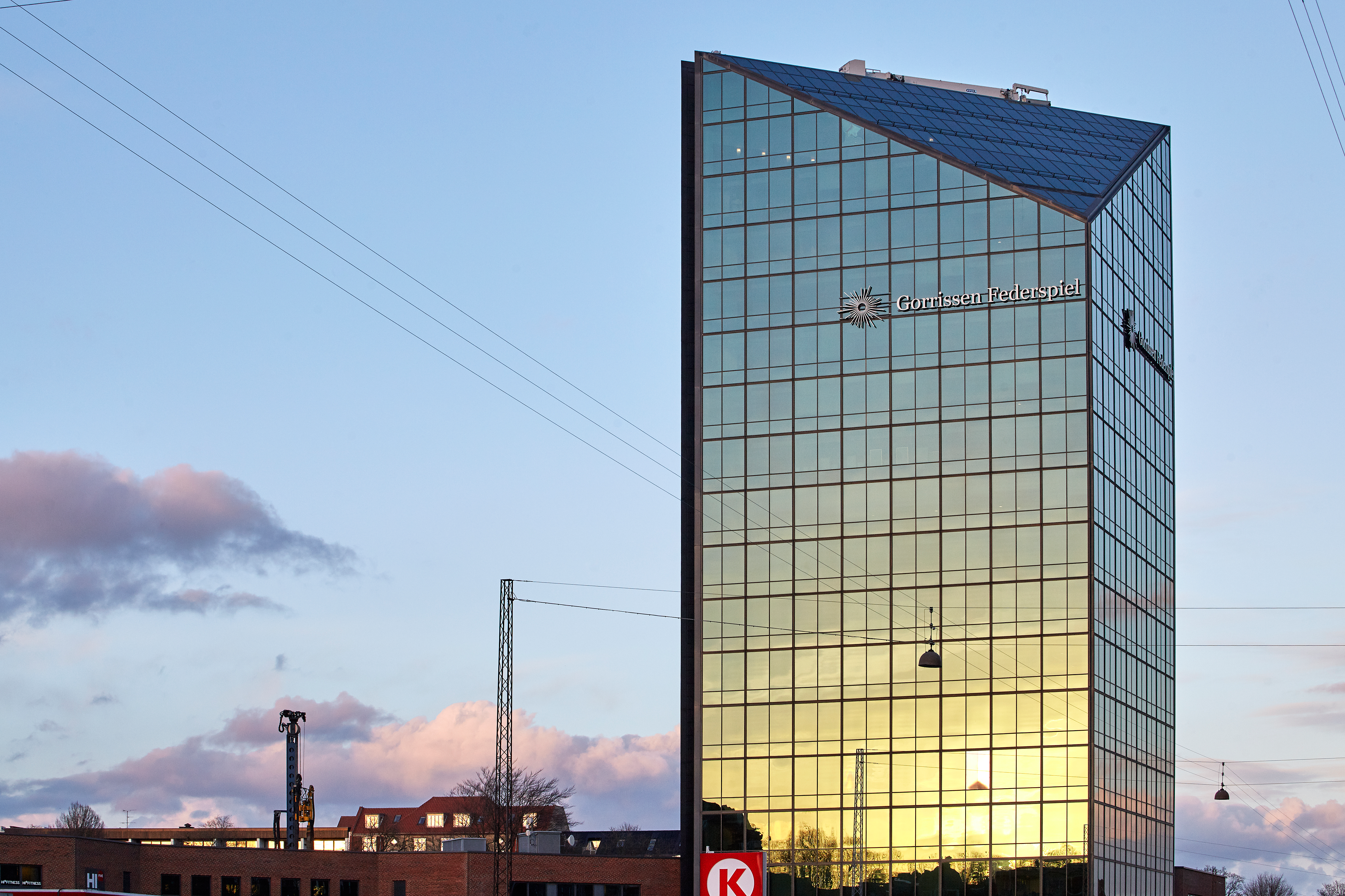 This 63 m high building is the first high-rise measuring more than 50 m in Aarhus. The building is called Prismet (Prism) owing to its triangular floor plan and the slooping roof area. The glazed façade, which appears almost black in daylight, is in stark contrast to the neighbouring clinker brick buildings.