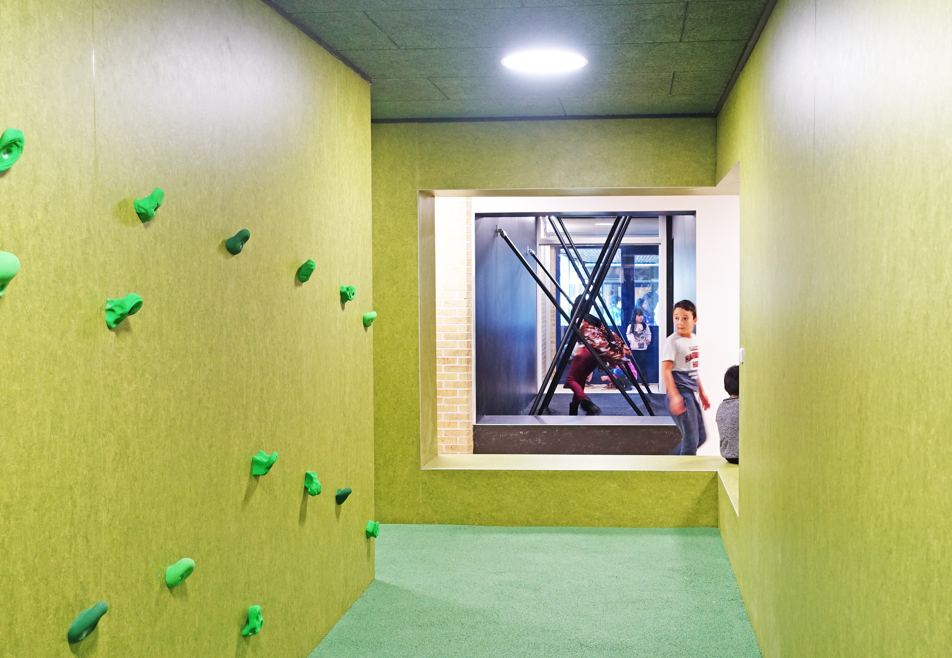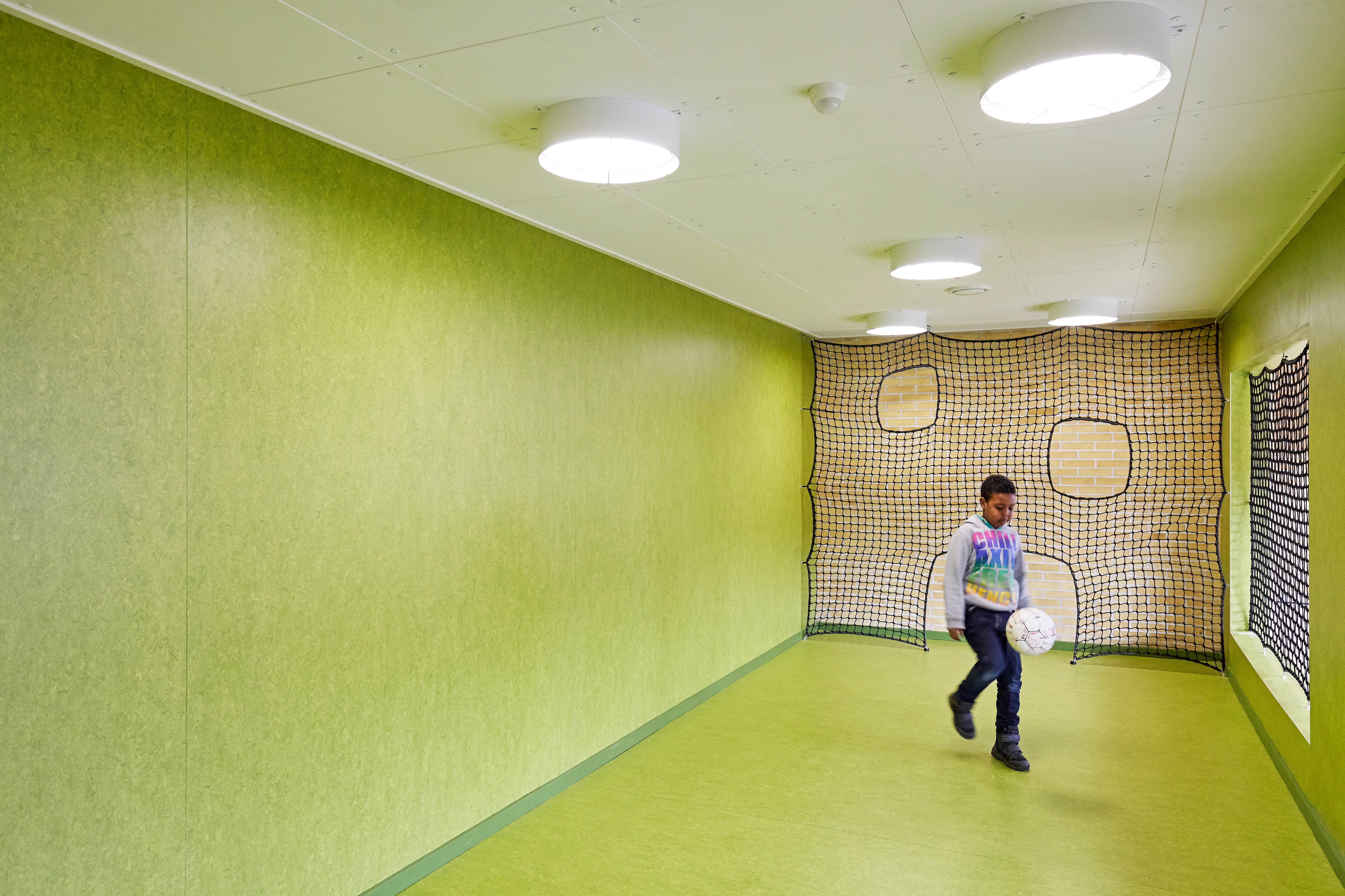 Søndervang School is one of six selected pilot projects, intended to inspire other schools in Denmark. The project consists of the ‘Motion Trail’, which proceeds through the school’s corridors: partly for use by pupils in both breaks and lessons, and partly geared to open up the school to the outside world. The Motion Trail consists of various hotspots here and there throughout the School’s main corridors, designed to generate new experiences, new approaches to exercise and learning, and environments. The environments were tried out and implemented as a natural part of the School’s new learning practices.