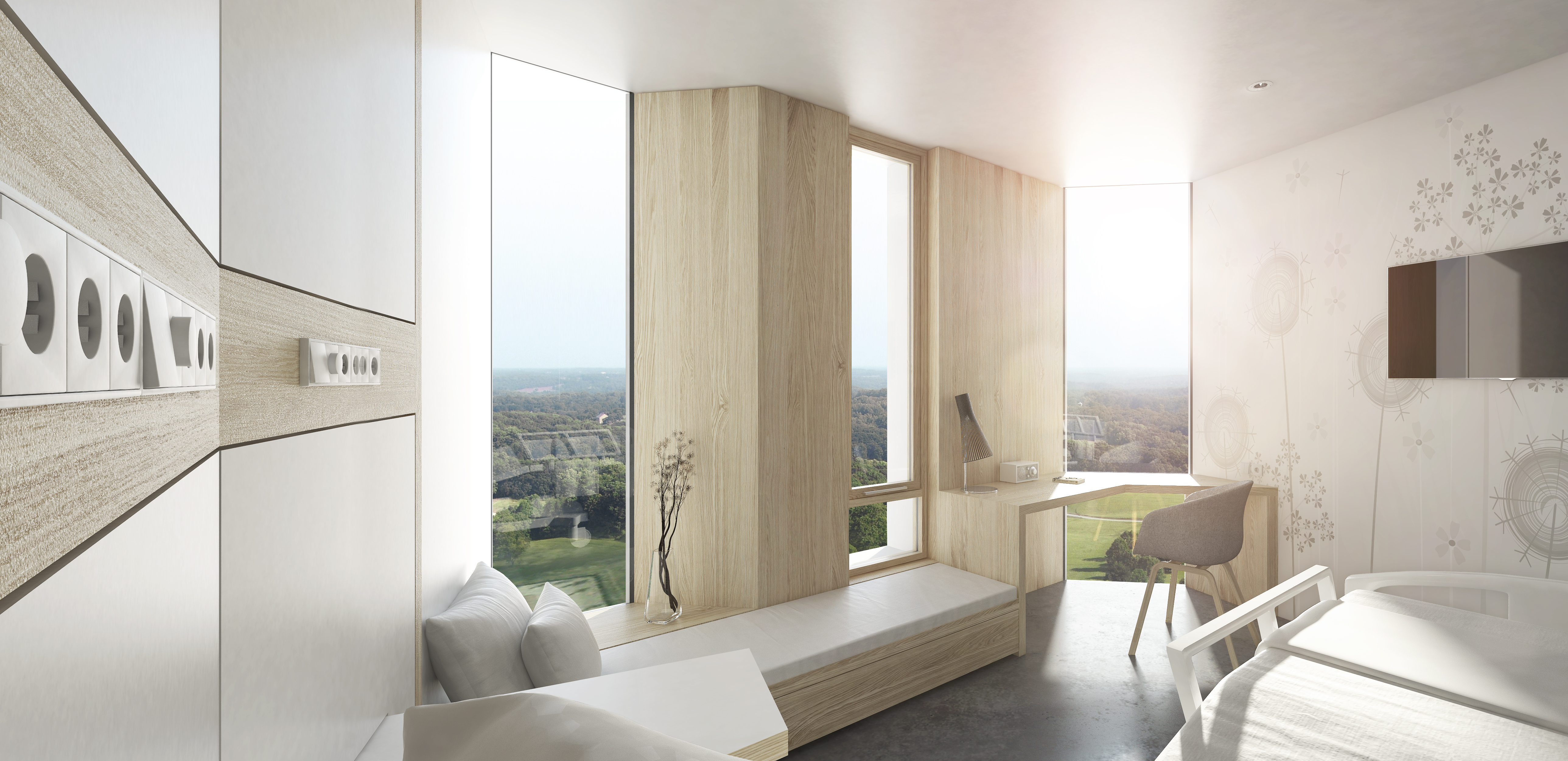 The buildings’ distinctive architecture means that the hospital will make a beautiful impact against a background of countryside and town. The existing rectangular hospital will form the basis for the new ward building, which will open like a fan, hovering over the forest reserve, creating the very best views, light and air for the wards and open areas. The project was designed with the explicit goal of creating a unified hospital, in which both old and new achieve maximum harmony.